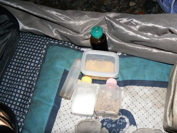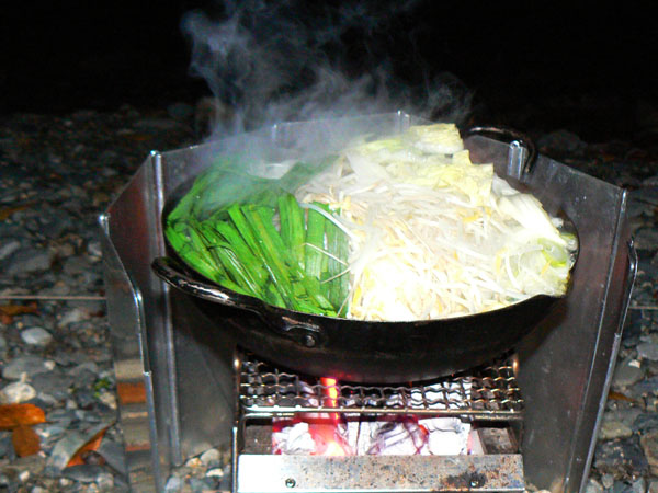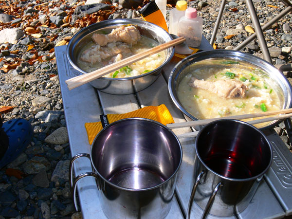 ほっとしたら、お腹も空いてくるってもんです(^^; 今夜のメニューは、『ミルク鍋』(^-^ 想像に反して(そして見た目もおいといて…)、とっても美味しいんです! 具沢山スープ鍋って感じのミルク鍋、あったまりますよぉ(^^ しかし、こんなにも恐ろしい八淵の滝をザック背負って歩くというのに、『ミルク鍋』を食べてるってのは、、、 こうして画像を順次チェックし、記事を書くにあたり、、、、 オィオィ、こいつらなにやってるんやって、、、自分で思ったり(^^;ぅ とりあえず、具材(キャベツ、パプリカ、にんにく、コンビーフ、ベーコン)を全部放り込んでから、牛乳、コンソメ、鷹の爪、を入れ、水分が少ないようなら水を加えて温めます。 先に具材を入れるのは、水を無駄に入れすぎたりしないようにです。。。 写真はややグロテスクですけど、、、気にしてはいけません(--; ですが、、、 強いて言うなら、問題は、ホールトマト、コンビーフ。 共にコンパクトにならない缶ゴミですよ(--; 美味しいかったのは言うまでもありませんが・・・お山では美味しいだけじゃだめなのに。。。(><) 今後はTPOに合わせたメニューを考えたいもんです(^^; いや、でも、しかし。 『涸沢カールで焼肉』目標に日々精進しているのですから、八淵の滝でミルク鍋ぐらいは軽くこなさねばならない課題か? ミルク鍋を作りながら、無事を祝して、乾杯タイムです(^-^ ぁう、、、床が斜めで缶が置けません(^^; 何か使えるものは。。。。。 ってことで、サンダルが臨時コースターです(^^; ビール、チューハイ飲み干してもまだお鍋は食べれません(T_T) 煮えるまで、ホットワインでも作りましょう(^^ ただぁっぁぁし、 いつでもささっと起きられるように、飲みすぎ禁止ですよ(・_・)キリリッ テントの斜め具合は、このように缶が床に直接置けない程度(左の写真、カップに入っているワインの斜め具合わかりますか?) 斜めレベルは3ってとこでしょうか? 天狗の森のときは、寝てる間にあたしも荷物も足元に『溜まって』しまうので、時々ダーリンが引っ張り上げてたらしいです。 それから比べたら快適レベルのうちかと思います。 炊事場もすぐ近くにありますし、ミルク鍋が焦げ付いてもOKです(嬉) 近すぎて、増水等考えると怖いですが、、、、 このテン場、キャンプ的にはNGでも山的にはOKか?。という、微妙なところでしょうか。 ミルク鍋、出来ましたよぉ~ いただきまーす! ほんっと、見た目は悪いですね(^^;オイシイノニナぁ・・・ コースを確認、翌日に備えて早めに就寝です。 お子ちゃまタイムの9時よりも更に早く寝すぎたため・・・・ 明け方というか深夜に目が覚める事になるのですが、、、 まだ滝は続きます。 しかも、事前調査によると、まだまだこれからが本番らしい ひぇ~~~ ぎゅっと目を閉じ、おやすみなさーい! (翌日へ続く) ・・・・・・・・・・・・・・・・・・・・・ ※以下、長編となった『八淵滝』の全記事へのリンクです(^^; 1.八淵の滝(序章) 2.八淵の滝1~お散歩コース 3.八淵の滝2 ~テントは張れるの?~ 4.八淵の滝3~ミルク鍋ってどうよ?! 5.八淵の滝4~屏風が淵と貴船の滝、遭難の碑 6.八淵の滝5~七編返しの滝 7.八淵の滝6~八雲ヶ原への道 8.八淵の滝7~八雲ヶ原キャンプ場(跡) 9.八淵の滝8~望武小屋-下山 PR