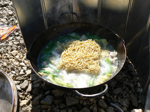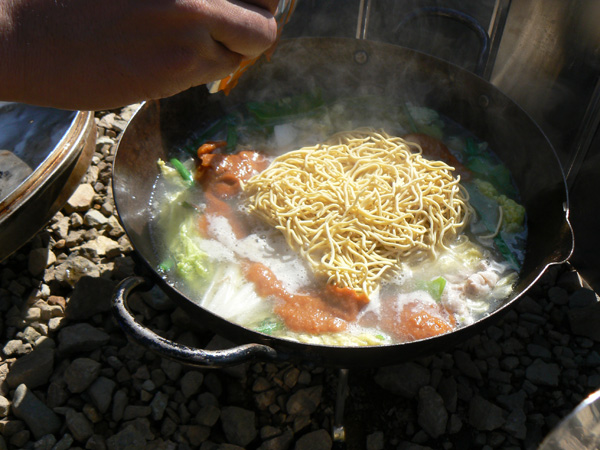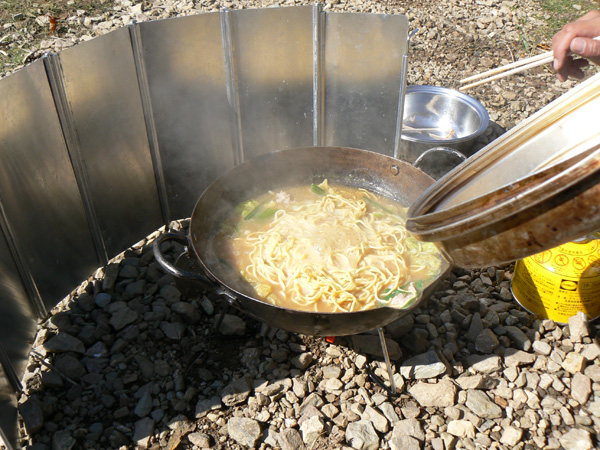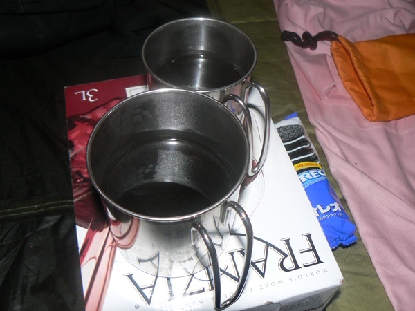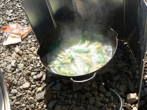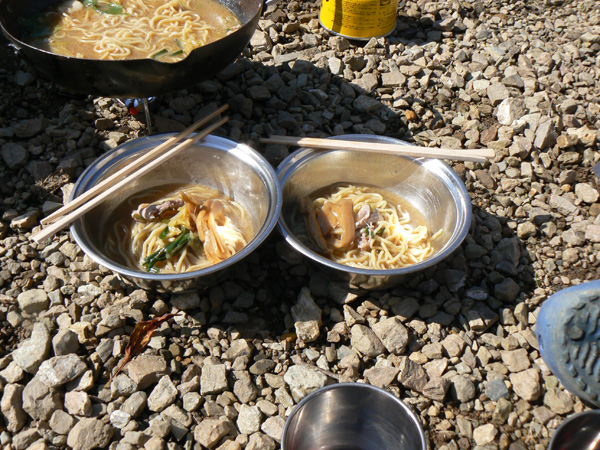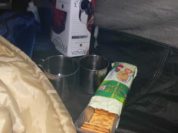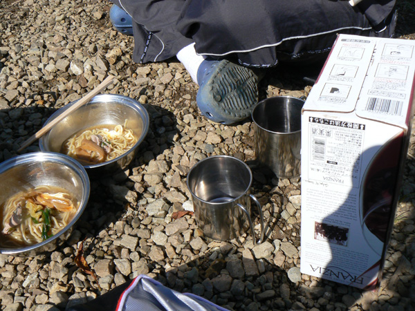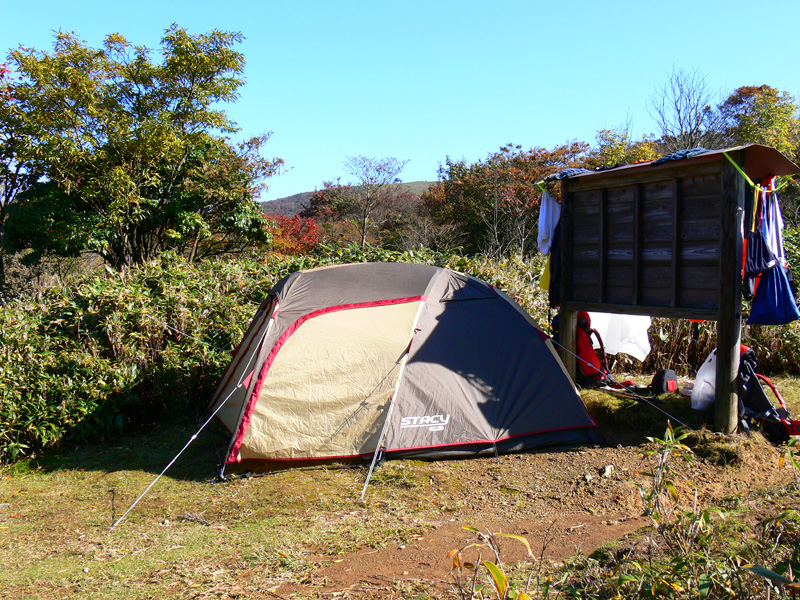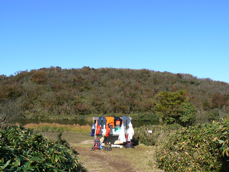 暴風雨の中、どんなところにテントを張っていたかというと・・・ 笹と案内板の陰にひっそりと設営しておりました(^^; これが、風防の役割になってくれた案内(?)看板、この池に纏わるお話しです。一読下さいませ、、、 あの暴風雨の、しかも薄暗くなりかけた中で、そこそこ水捌けが良く、そこそこ水平な場所を確保できたのは助かりました。。。 にもかかわらず・・・・、テントの防水力が、、、、、。布地?が弱っているのでしょうか? 地面や、グランドシートとテントの間に水が溜まっているわけでもないのに、ジワーッと滲みてくる雨水。。 イスカのマットのおかげで、濡れる事はありませんでしたが、テントの床面を雨が止むまで(深夜まで)キャンプタオルでふき取っていました(T_T) これは今後の雨キャンの大きな課題ですね。 なんとかしなければなりません。 とりあえず、撥水スプレーを噴き掛けておいたのですが・・効果の程はまだハテナです。 これで乗り切ってくれるといいのですが・・・ しかしまぁ、テントも無事設営出来、濡れた服を着替えると、紫色だった私の唇も色を取り戻し、生き返ったような気分(^^ テント内にジンワリ水が滲みて来るくらいなんてことはありません。 拭けばいいだけですから。 さらに、zippo君に点火、2個づつポッケに忍ばせて、今日はコーヒーで二人とも揃って生きてる事に、乾杯ですぅ(T_T)ウルウル ![]() Zippo(ジッポー) ハンディウォーマー あったかぁぁぁい(^-^* あー、シアワセですぅぅ あのフランジアが、この日はコーヒーのテーブルになっているなんて・・自分達でさえビックリ(苦笑) と、落ち着いたところで、お腹がグゥ〜 水場があるかないかわからないので、なるべく洗うのが楽なように『水炊き』です。 ラジオを聴きながら、フランジアを飲みながら・・・ テントの床面を拭き拭き(^^; 外の空模様を気にしながら・・・ テントの床面を拭き拭き(*_*) 日付が変わって暫くすると、徐々に風も雨もおさまって来て、やっと眠る事が出来ました。 一夜明け・・・ 昨日の嵐が夢だったかのような、これでもかーってくらいの快晴! 雲ひとつない青空が広がる小女郎ケ池。 ボチョボチョになった服や荷物を乾かしながら、朝食の準備。 昨夜の水炊きの残り汁で煮込みラーメンを作ります。 ラーメン一個分の大きさなのに、これで二人前なんです! 山行きには嬉しいコンパクトな、しかも麺が硬く太く、バラバラに割れにくいという優れものラーメン。 しかし・・・、これが二人分になるって、どんだけのびるんでしょ?(^^; 昨夜の水炊きのお野菜やお肉、朝の為に少し残しておいたものを投入(^-^ 続いて麺を投入! お味噌も入れて、グツグツ煮込みます。 お気づきの方もいらっしゃいますでしょうか? ガスポン事件で使えなくなったプリムスのウルトラバーナーに代わって購入したのは、分離型のこれ。 ![]() PRIMUS(プリムス) P−123S メッシュスパイダーストーブ(点火装置付) 今回デビューです。 目下アルコールバーナーもテスト中ですが、やはりガスは一個は要るだろうと購入。 これだったら、ガスは完全に風防の外に出せるし、安心です(^^; 煮込めたら、朝っぱらなのでちょびっとだけ、フランジアを添えて、いっただきまーす。 このラーメン、ほんまにしっかり二人分に増えて(膨れて)ました。 さぁ、そろそろ、テントや荷物は乾いたでしょうか? すっかり全部といっていいほど、ボチョボチョになった荷物。 翌朝は、暴風雨の前日とは打って変わっての快晴だったので、この際とばかりに、全部放り出して乾かしました。 折角なので、写真もパシャパシャ。 次の記事では、我が家のトレッキングキャンプの持ち物を公開いたしますねー(^-^;