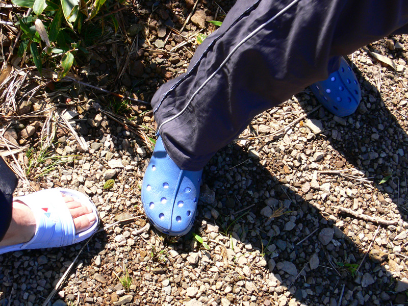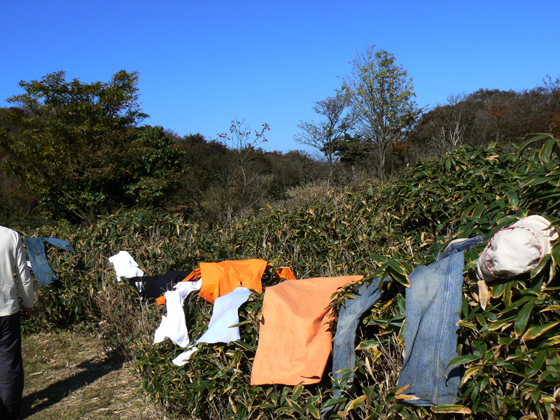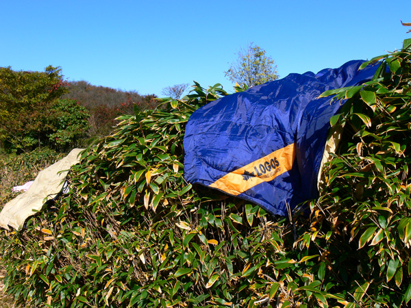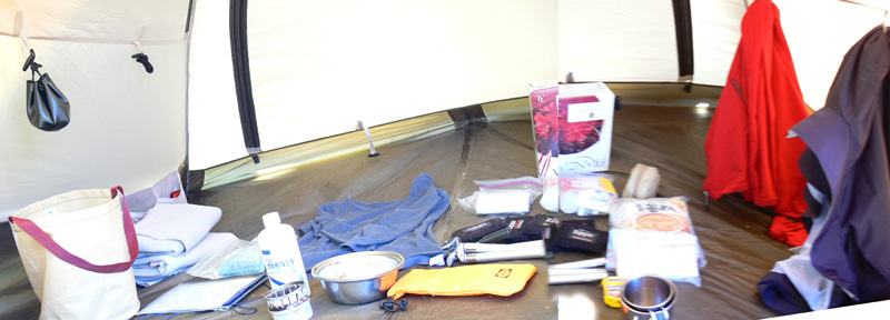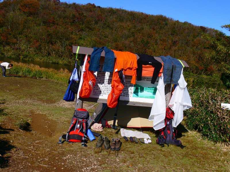 吹き飛ばされなくてよかったって思うくらいの暴風雨により、ザックの中身まで湿っぽくなってしまっています。 この日は、坂下町のバス停に下りるだけの行程だったので、お昼に出ればバスに間に合うね、と、ボチョボチョの荷物たちの天日干しを開始! 折角なので(?)、我が家のトレッキングキャンプの持ち物たちのお披露目をば(^^*テレテレ 上の写真は衣類のほか、キャンプタオル。 ![]() Chinook(チヌーク) キャンプタオル(M) ![]() MSR パックタオルウルトラライト 今、使っているのはこの2種ですが、チヌークの方は、正直に言ってただの厚手のフェルトって感じ。吸水性は普通の綿のタオルと比べて、いまひとつ、いいんだかどうなんだか、、、、。 MSRの方は、ものすごく丈夫な和紙のような感じ。 こちらも、吸水性は甚だ疑問(あくまで普通の綿タオルと比べてですけどね)。 速乾性は、薄手の痩せた綿のタオル(つまり安物、、^^ゞ)が、断然一番。 う〜ん、キャンプタオル、なにかいいのはないかなぁー。。。。 いつも床下浸水から守ってくれてありがとう。。。 持っててよかったのイスカのマットと、ワゴンセールで買った怪しいピンク色のシーツ。 連結できるのが嬉しい、ロゴスのスリーシーズンシュラフ。 ジーンズ、Tシャツ、靴、ポンチョ、ザックにザックカバー、ステッキ、靴、タオル数枚、雑巾数枚、カメラケース、帽子、100均の折り畳み座布団(休憩用)、収納用に使っている袋、あ、袋に入ったまま干している明かり&機械セット(ヘッドライト2、ランタン1、予備の充電池12個、カメラ用の充電池4個、ラジオ)、あと、写真ではわかりにくいですが、ザックにくくりつけたコンパス。 参考までに、写真の左端にヘッピリ腰っぽい格好で写っているダーリンが激写していたのは・・・何者かのうんちです。 小さめに載せておきますので、、、見たい人だけクリックしてください(^^; ↓ 山泊をはじめてからキャンプ用品に多少の変化が出たのは当然なのですが、今までから下界(?)のキャンプで使っていたアウトドア用品をザックに詰めて山登り&野営をしようというのだから、なかなか大変(苦笑) 軽くてコンパクトなのははもちろん、至れり尽くせりの山用品、買い揃えたいのは山々なんですけど・・・ 今のところ山行きの為に買ったのは、ザックとステッキと靴だけ。。。 さすがに背負子で山登りはきつすぎだったので買いました(苦笑) まぁ、いずれぼちぼちと揃えて行きたいとは思っています(^^; 参考にしていただけたら幸いですが、山用グッズを買い揃えられる方は、いずれボチボチなんて言ってないで、とっとと買い揃えて下さいね(^^; テントの中で干し中(?)なのは、、、 広角レンズ、三脚、フリース、地図ケース、PDA、スノーピークのバケツ、ババシャツ&パッチ(ジジの方はまだ着用中)、食器類、薬セット、フランジア、ハンカチ、ティッシュ、補修その他セット、zippoのハンディウォーマー、調味料タレ瓶入れ、トイレットペーパー、オイルサーディン等の非常食、歯ブラシ、チャッカマン、非常時用のエスビット、コンロ、防寒用に薄手のジャンパー、そして実験中のアルコールバーナー。 このスノーピークのバケツは、重宝しています。 本来のバケツとして活躍することはあまりないのですが、食材など、クーラーボックスで保冷しなくていいのだけれど、でもそのままザックに入れるのは汁漏れなどが心配なもの(冷凍されたものや野菜なんかですね)はこのバケツに放り込んでおけばOK。 ![]() スノーピーク(snow peak) キャンプバケツ 中身が空になった帰りには、そのままクシャクシャっと丸めてしまえるのが嬉しいですが、そこで心配なのは、丸めた時の折り目=>『穴開き』。 ソフトタイプのウォータージャグはいくつも駄目にしてきた私たちですが、しかしこのバケツ、もう一年以上(ってことは、私たちの場合、50回以上の出動)、元気に活躍中です。 その他に、風防、中華鍋、ろうそく、クーラーボックス、水。 既に飲み食いしましたが、クーラーボックスの中には、ビール500l入3本、チューハイ350入4本、鍋用の鶏肉や豚肉が入っていました。 私たちは決して『ピーカー』のつもりはないのですが、ここでまたスノーピーク商品のお勧め。 ![]() スノーピーク(snow peak) ソフトクーラー11 スノーピークのソフトクーラーは凄いっ! 他のソフトクーラーとは、保冷力が断然違います。 夏場でも、コンビニで売ってる板氷が1.5〜2日間は持ちます。 ひょっとすると(使ったことがないのでわからないのですが)ハードタイプと同等かも? 唯一持っているハードタイプである、Co*e*a* のすごく安いやつよりかは、断然素晴らしいです。 ![]() キャプテンスタッグ(CAPTAIN STAG) アルミカセットコンロ用ウインドスクリーン 風防は折りたたんでちょっとしたテーブル代わりにもなるので、これくらいの大きさのあるものがいいですね。 また、保冷材については、一時期LOGOSの氷点下パックに感動したこともありましたが、しかし保