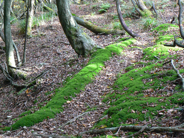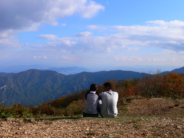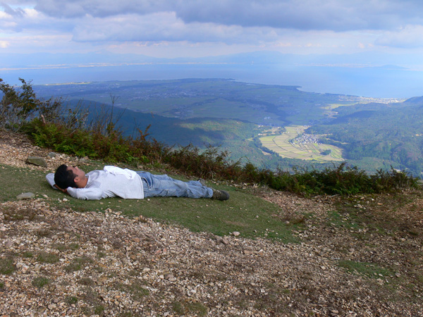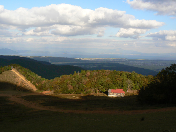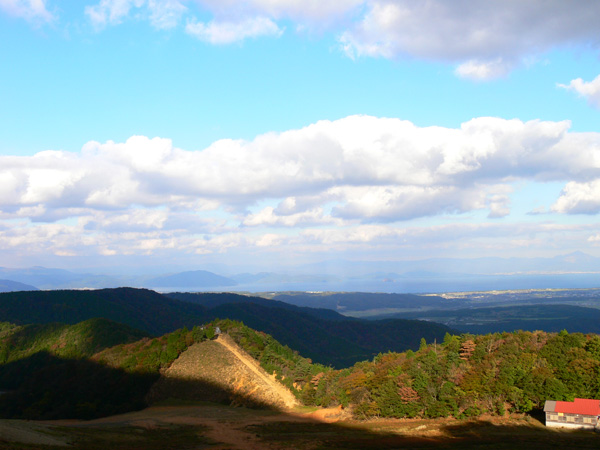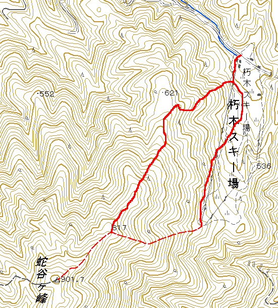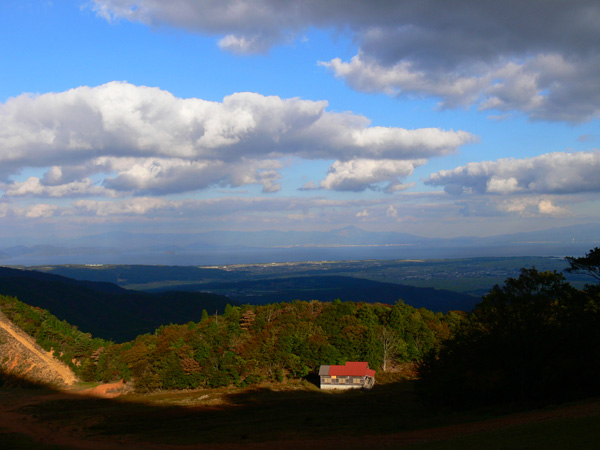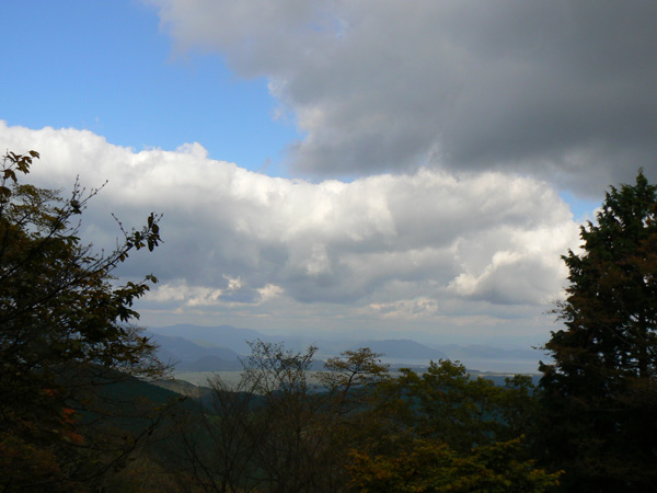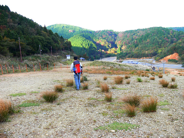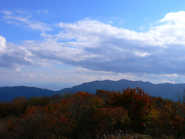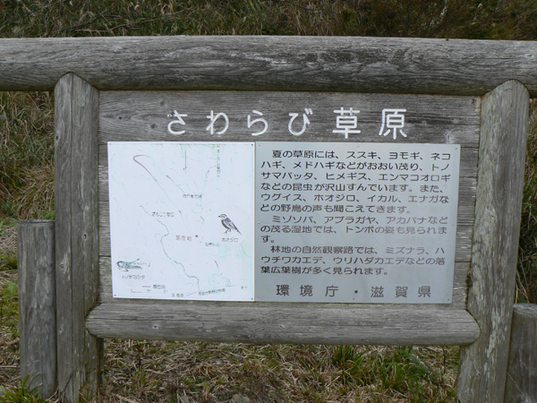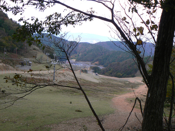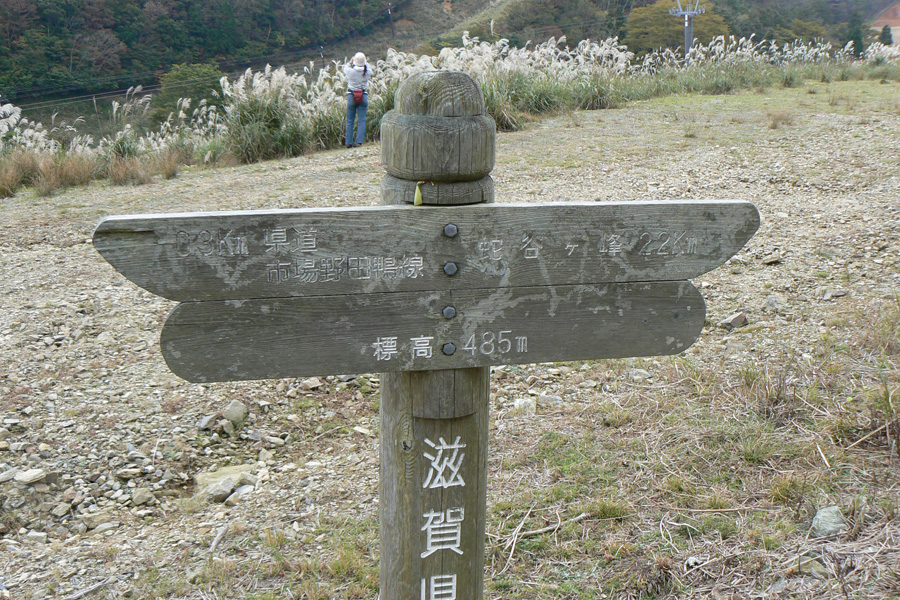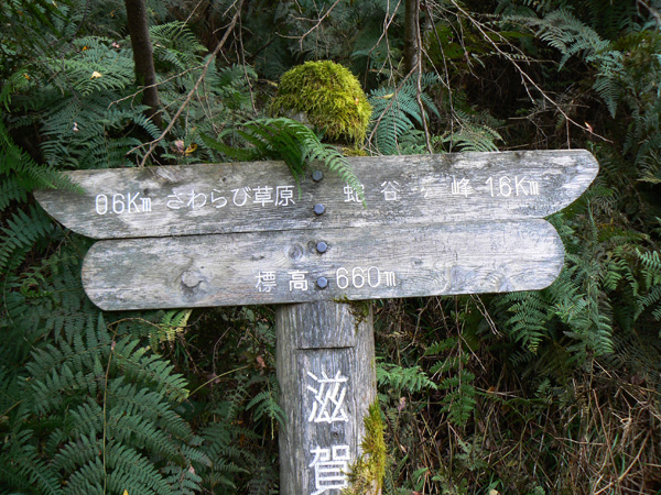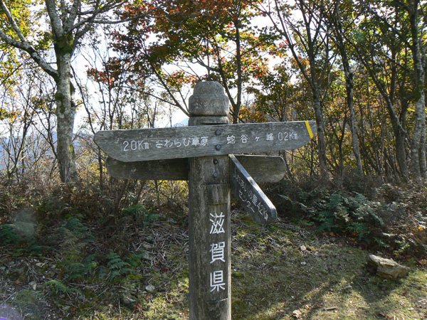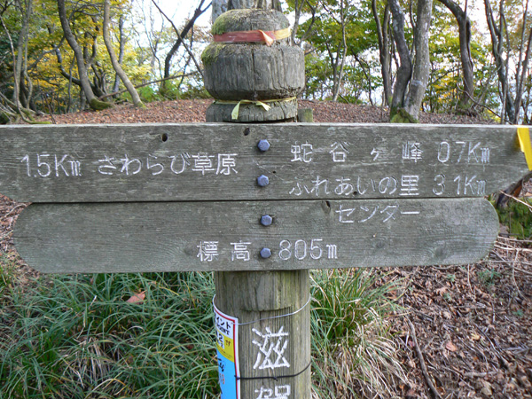 先週行ってきた恐怖の八淵の滝~八雲ヶ原コース、恐怖覚めやらぬ間に紹介したいのですが、その前の2コースを書かないと忘れそうなので、、、ささっと紹介させていただきます(^^; 行き先: 蛇谷ヶ峰 コース: さわらび草原コース 日 時: 11月03日(土曜日) 13:15発 朽木スキー場 →(2.2km)→ 14:10着 蛇谷ヶ峰 14:25発 →(2.5kmくらい?)→ 15:10着 朽木スキー場 比良山系でも人気の山『蛇谷ヶ峰』、天気がいいとほぼ360度ぐるーり見渡せる絶景のスポット。 琵琶湖はもちろん、琵琶湖に浮かぶ竹生島、更に対岸の湖東方面、そしてその向こうの山々までも見渡せるのですから、人気があるのも頷けます。 この『蛇谷ヶ峰』山頂への道、幾つかのコースがあります。 思い起こせば・・・ 二人して70リットル&50リットルのザックを背負って、大野から登って、天狗の森付近で野営、グリーンパーク想い出の森へ下りて来た時の『蛇谷ヶ峰』は、かなり苦戦しました。。。 それと比べれば、この度の『さわらび草原コース』は、ちょっとしんどいお散歩って感じで、半日で往復できるお手軽なコースです(^-^ 上の地図で、スキー場入り口から少し南に下り、赤い軌跡の右手に進むコースで登りましたが、時間があまりないとき、山登りには自信がないけど、山頂からの景色は見てみたい、なんて方は、このコースがいいんじゃないかな(^-^ と、言うことで、この日は出発が完全に午後からになる為、簡単に行って帰って来れるコースっぽい、『蛇谷ヶ峰、さわらび草原周遊(?)コース)』を選びました。 反省会は、『朽木大野河原(キャンプ場)』だったので、一旦キャンプ場入りし、テントを設営してから車で朽木スキー場へ向かいました。 それでは、順を追ってこのコースを紹介してまいりますねっ。 朽木スキー場の駐車場に車を停めます。(駐車料金無料) スキー場の管理棟の前にも駐車場はありましたが、チェーンがかかっていたので道を挟んだ側に車を入れます。 道の先は、どこへ抜けられるのでしょ?やけに古い、怖そうなトンネルが・・・ 綺麗な青空が広がっています。 今日こそは、蛇谷ヶ峰からの展望を楽しめそうですっ。 (前回は、雨、濃霧・・視界は数メートルでした。。。) 管理棟前の駐車場のはずれに蛇谷ヶ峰登山口の案内板が立てられていました。 駐車場右手の赤い屋根のスキー場管理棟横を入ります。 やや左手にはグレーの屋根の新しい、綺麗な建物がありますが、新しさに釣られてそちらに向かうと、ゲレンデの真中に出てしまい、登山道入り口へは少し迂回することになってしまいます(←私たち)。 管理棟の先にはキッズゲレンデ。 使われているのかどうかは、『ハテナ?』って感じの動く歩道なるものがありました。 キッズゲレンデを登り、さらにしばらく山沿いに登ると、 登山口付近にある公衆トイレです。 紙なし、汲み取り式ですが、手洗い水も出ますし、使用可能です。 使えるトイレがあるってだけで十分、ありがたいですよね(^^; 蛇谷ヶ峰山頂まで2.2km、既に標高も485m。 距離も手ごろだし、高さもあと416m程登るだけ(?)です(^^; トイレを越え、案内板の矢印方向へ100mばかり進むと、またしても案内板。 いよいよ山道に入ります。 行って来まーす! 迷いようのない歩きやすい山道を、空荷で軽快に進んで行きます(^^ 気持ちのいい天気に、足取りも軽く、 神様のような、大きな樹木の横を通り過ぎ、 丸太のベンチで一休み(^-^ ベンチまで用意されてるとは、快適ですぅ。 あと700m、もうひといき、がんばるぞっ。 蛇谷ヶ峰方向の雲がちょっと怪しげな色合いで分厚目ですが・・・気にしないようにしましょう(^^; グリーンパーク方面からの道との合流点まで来ると、ラスト200m。 ここから先は、ステッキなしで立ってるのが少々大変な、かなりの急勾配になります。 一気に登り切ってしまうと・・・・ 目の前にはすんばらしい風景が広がります(^-^ ここまで登って来た人だけが見られる、自然からのご褒美。 『がんばったね』って言ってくれてるようです(^-^ 雲の分厚い方向もあったけど、ほぼ360度の展望。 暫し並んでぼーっ。 寝ッ転がってぼーっ。 ぁあ・・やっぱそのうちここでテント張りたい(^^; いつまでも、グズグズしてたいけど、そろそろ下りないと、日暮れてしまっては大変です。 14:25 ディパックを背負って、しゅっぱぁ~つ! 蛇谷ヶ峰頂上から今来た急坂をずり落ちながら下ると、やがてなだらかな坂道。 登って来た道をグリーンパークからの登山道との合流よりも少し先まで、しばらく引き返すと、やがて分れ道。 下りはここを右へ進んでみます。 ほんの数m進んだだけで、『これってどこが道やの?』っていう状態。 踏み跡が全く見えません、、、、。 そして苔、苔、苔の、苔地帯へ突入(^^; 感触がネコの肉球のような、いつまでも触っていたいような苔や、 角刈りの頭のような、これまたいつまでも触っていたいような苔が、 木はもちろん、目印のリボン(ジャージの切れっ端ですが、、)にもぎっしりと。 踏