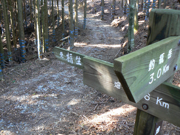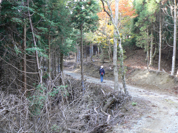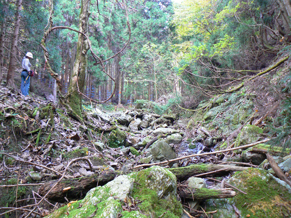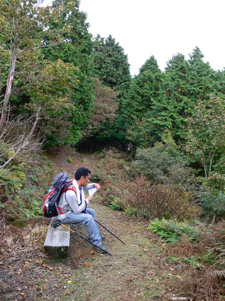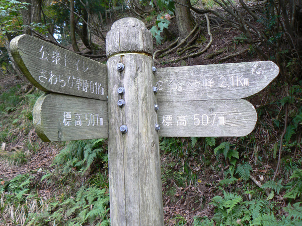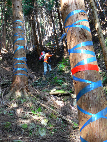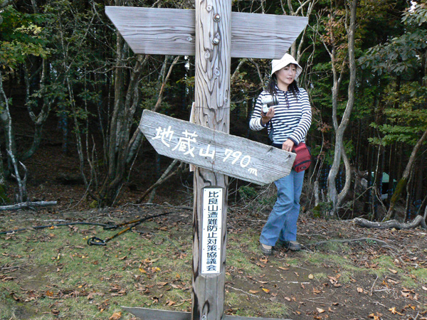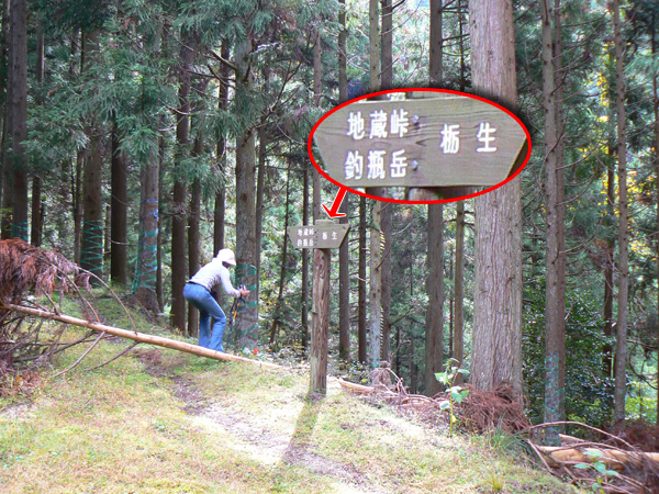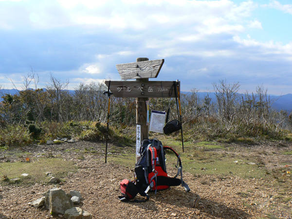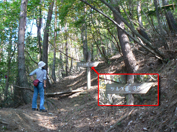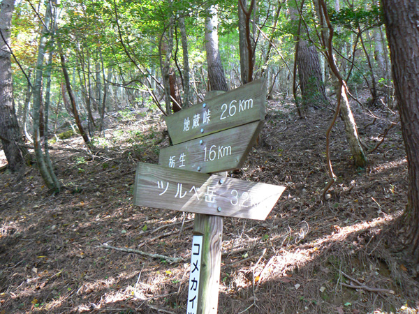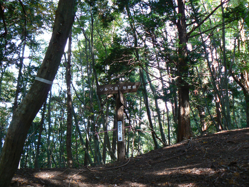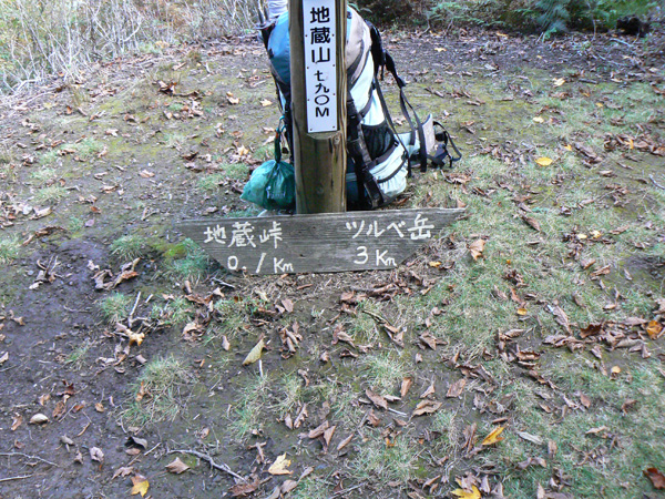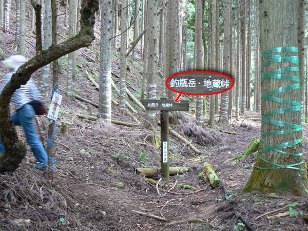 ロープ、土砂崩れ、倒木、落石、川渡り、そしてまたロープ・・・ 『難路』と書かれた登山地図になんとなく納得しながら、、、緊張を解く事無く慎重に進みます。 運動不足のあたしは、普段使わない筋肉(贅肉?)が突然フル稼働させられて悲鳴を上げてるって感じで、ガクガクです(^^; 少し道っぽい尾根道に入り、ちょっとホッ。。 細いながらも『普通に立って歩ける』のが嬉しい(^^; なぁ、なぁ・・・ 振り返るとダーリンがはるか遠くに、、、、 こんなに距離を開けてはいけません(><) 常に1メートル圏内に居ないとはぐれたら大変ですぅ。。。 なぁなぁ、 なんやの? 難路っちゅうとこ、もう終わったんかな?(終わってたらいいなぁ・・・) ・・・ まだやと思うわ。 うん・・・ まだまだみたいやわ。 なんでこんなあっちこっち崩れてるんかな(T_T) なぁ、 空荷でこんなことになってるんやで お米背負ったら絶対おちるで・・・ なぁ、 昔の米屋さんに生まれへんでよかったなぁ。 等と話しながら急斜面にへばりつくように歩いてきた難路をなんとかクリア。 身体の左側が常に急斜面だったので、左足だけが妙に辛いです。 と思ったら ...今度は沢です。 どっち行ったらええのん? 次はどこが道? 案内リボンを探しながら進みます。 案内板ですぅぅ でも、倒れています。 しかも見ての通り、苔まで、、、(T_T) シシ谷というところだそうです。 沢からくっついたり離れたりしながらしばらく進むと、行く手に滝。 ちょっと前に必死で渡った滝が蘇ります(><) なぁ・・・ ここ、降りるんかな? ロープないけどなぁ? もう、何がなんだかわかりませんが、おそらくココも崩落、道がつぶれてしまったのでしょう。 折角登って来たのに、下るなんて勿体無いやん(T_T) 下りたくないなぁ・・・ ほら、またこんな急なとこ登らなあかんやんか と、ブツブツ言いながら登りきると、気持ちのいい歩きやすい道の登場です! ついに難所は終わったのか?! 辛い道ではないですが、踏み跡がさっぱり見えません。 広い、広ーい地球の表面の、自分たち以外誰もいないこの山奥で、呆然と立ち尽くす私。 きょろきょろとしながら次のリボンをようやく見つけ、それをたどります。 『×』と教えてくれても、どっちに行ったら×なのかが分かりません、、、、(T_T) またもや倒れた案内板。 道は間違っていないことが分かるだけでもありがたいですが、方向もちゃんと教えてくれるともっと嬉しいです。 迷わないよう、先、先の案内リボンをチェックしながら、沢をあっちこっちに渡りながら登り、次は植林地帯へ突入。 暫く登ると突如現れる案内板。 地蔵峠まで500m。 先が見えてきましたよぉ(T_T)うるるん。 、、、しかし。 山頂どころか、尾根すらも見えへんで? 今の時点で視界に入らない尾根まで、500mで一気に出るんかい、、、、ホンマか? 幸い、踏み跡(っぽ)も見えてきました。 踏み跡(っぽ)と案内リボンを確かめながら、かなりの急坂を木に捉まりながら登ります(^^; ゼェー、ハァー、ゼェー、ハァー 植林地帯の中、いつのまにかまた踏み跡はさっぱりですが、少し先に尾根が見えてきましたっ! 無理矢理登ってしまいます(^^; やたっ!到着! 案内板に記された『地蔵峠』の文字に感激(T_T)ウルウル 私たちが今、登ってきた道はほんの付け足しのように(いや、ほんとに付け足しだし)扱われています。 まぁ、こんな道ですから、仕方がありません(T_T) こちらがメインの釣瓶岳⇔蛇谷ヶ峰の尾根道。 お地蔵様ですぅ 無事に着けた事に感謝して、手を合わせます(^^ 地蔵山山頂まではあと100m。 地蔵山で、お昼ご飯にしましょう(^-^ ほっとしたらお腹がグぅ~ 地蔵山へ向かって歩きながら、気になるのはこの広い道。 車とか走ってそうな道やなぁ? でも、あんなフウフウ言いながらここまで来たのに、車が走って来たらちょっとショックやで・・・ と、話しながらも終に13:57『地蔵山』山頂到着です! 11:37に難路コース突入後2時間20分。 地図にあるコースタイムは2時間ですから、休憩込みで2時間20分なら、まずまずでしょう。 と、二人で満足していると、、、 え゜~~~!!なんと・・・ 軽トラ、、、、、、。 これってどういうことや? な、な、nちゃん? なぁ・・・、 地蔵山山頂って、もしかしたらオートキャンプできるんちゃうん(--;) 続く