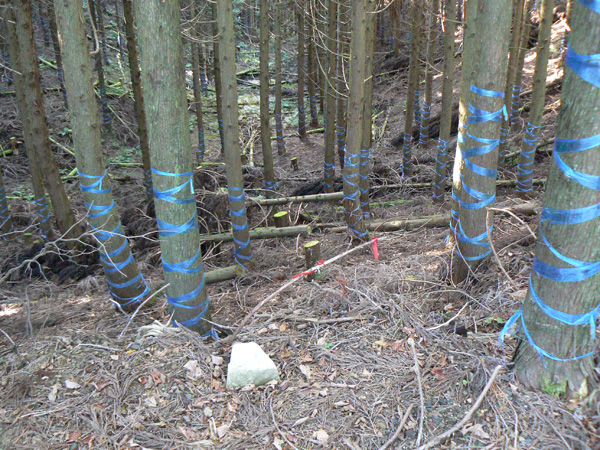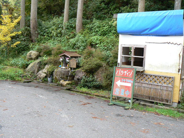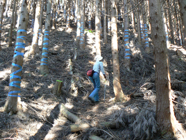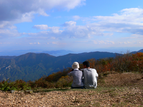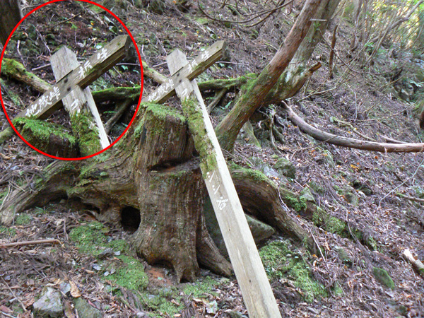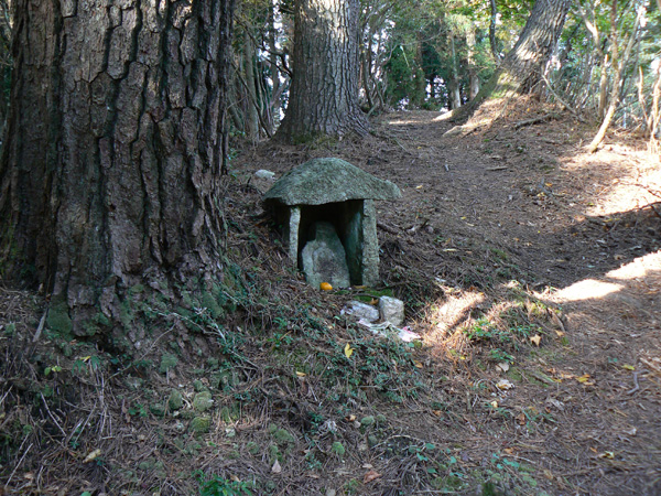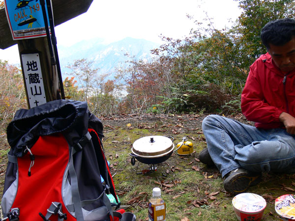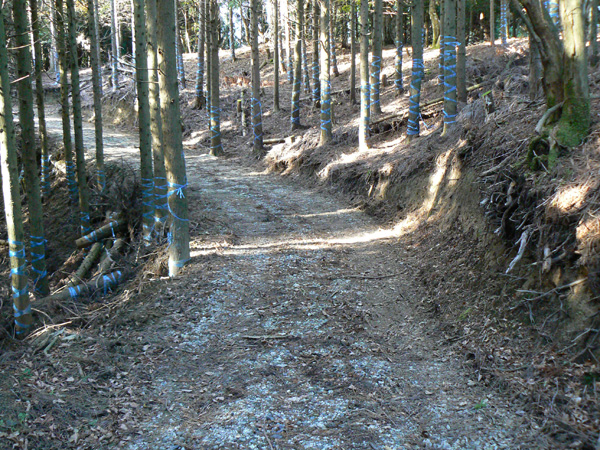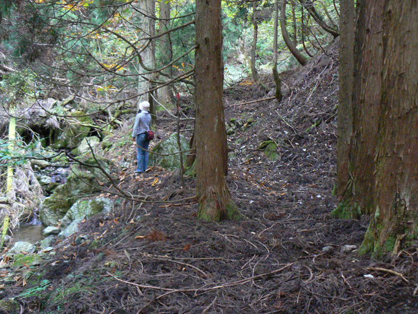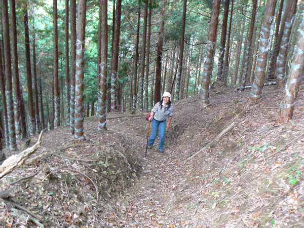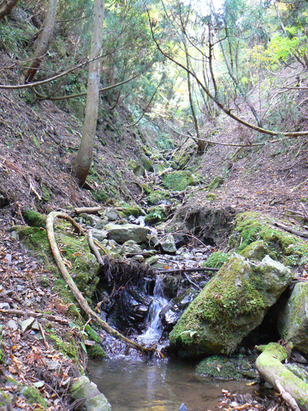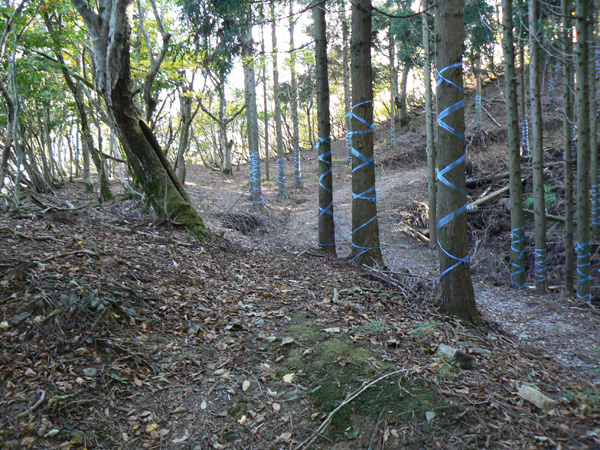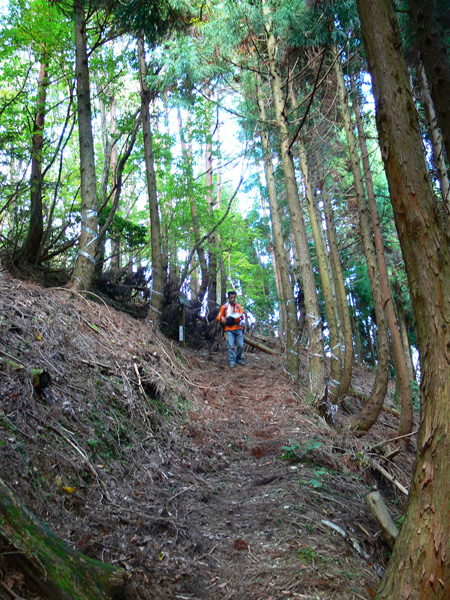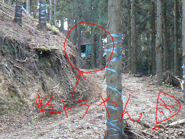 ロープ、土砂崩れ、倒木、落石、川渡り、そしてまたロープ・・・ 『難路』と書かれた登山地図になんとなく納得しながら、、、緊張を解く事無く慎重に進みます。 運動不足のあたしは、普段使わない筋肉(贅肉?)が突然フル稼働させられて悲鳴を上げてるって感じで、ガクガクです(^^; 少し道っぽい尾根道に入り、ちょっとホッ。。 細いながらも『普通に立って歩ける』のが嬉しい(^^; なぁ、なぁ・・・ 振り返るとダーリンがはるか遠くに、、、、 こんなに距離を開けてはいけません(><) 常に1メートル圏内に居ないとはぐれたら大変ですぅ。。。 なぁなぁ、 なんやの? 難路っちゅうとこ、もう終わったんかな?(終わってたらいいなぁ・・・) ・・・ まだやと思うわ。 うん・・・ まだまだみたいやわ。 なんでこんなあっちこっち崩れてるんかな(T_T) なぁ、 空荷でこんなことになってるんやで お米背負ったら絶対おちるで・・・ なぁ、 昔の米屋さんに生まれへんでよかったなぁ。 等と話しながら急斜面にへばりつくように歩いてきた難路をなんとかクリア。 身体の左側が常に急斜面だったので、左足だけが妙に辛いです。 と思ったら ...今度は沢です。 どっち行ったらええのん? 次はどこが道? 案内リボンを探しながら進みます。 案内板ですぅぅ でも、倒れています。 しかも見ての通り、苔まで、、、(T_T) シシ谷というところだそうです。 沢からくっついたり離れたりしながらしばらく進むと、行く手に滝。 ちょっと前に必死で渡った滝が蘇ります(><) なぁ・・・ ここ、降りるんかな? ロープないけどなぁ? もう、何がなんだかわかりませんが、おそらくココも崩落、道がつぶれてしまったのでしょう。 折角登って来たのに、下るなんて勿体無いやん(T_T) 下りたくないなぁ・・・ ほら、またこんな急なとこ登らなあかんやんか と、ブツブツ言いながら登りきると、気持ちのいい歩きやすい道の登場です! ついに難所は終わったのか?! 辛い道ではないですが、踏み跡がさっぱり見えません。 広い、広ーい地球の表面の、自分たち以外誰もいないこの山奥で、呆然と立ち尽くす私。 きょろきょろとしながら次のリボンをようやく見つけ、それをたどります。 『×』と教えてくれても、どっちに行ったら×なのかが分かりません、、、、(T_T) またもや倒れた案内板。 道は間違っていないことが分かるだけでもありがたいですが、方向もちゃんと教えてくれるともっと嬉しいです。 迷わないよう、先、先の案内リボンをチェックしながら、沢をあっちこっちに渡りながら登り、次は植林地帯へ突入。 暫く登ると突如現れる案内板。 地蔵峠まで500m。 先が見えてきましたよぉ(T_T)うるるん。 、、、しかし。 山頂どころか、尾根すらも見えへんで? 今の時点で視界に入らない尾根まで、500mで一気に出るんかい、、、、ホンマか? 幸い、踏み跡(っぽ)も見えてきました。 踏み跡(っぽ)と案内リボンを確かめながら、かなりの急坂を木に捉まりながら登ります(^^; ゼェー、ハァー、ゼェー、ハァー 植林地帯の中、いつのまにかまた踏み跡はさっぱりですが、少し先に尾根が見えてきましたっ! 無理矢理登ってしまいます(^^; やたっ!到着! 案内板に記された『地蔵峠』の文字に感激(T_T)ウルウル 私たちが今、登ってきた道はほんの付け足しのように(いや、ほんとに付け足しだし)扱われています。 まぁ、こんな道ですから、仕方がありません(T_T) こちらがメインの釣瓶岳⇔蛇谷ヶ峰の尾根道。 お地蔵様ですぅ 無事に着けた事に感謝して、手を合わせます(^^ 地蔵山山頂まではあと100m。 地蔵山で、お昼ご飯にしましょう(^-^ ほっとしたらお腹がグぅ~ 地蔵山へ向かって歩きながら、気になるのはこの広い道。 車とか走ってそうな道やなぁ? でも、あんなフウフウ言いながらここまで来たのに、車が走って来たらちょっとショックやで・・・ と、話しながらも終に13:57『地蔵山』山頂到着です! 11:37に難路コース突入後2時間20分。 地図にあるコースタイムは2時間ですから、休憩込みで2時間20分なら、まずまずでしょう。 と、二人で満足していると、、、 え゜~~~!!なんと・・・ 軽トラ、、、、、、。 これってどういうことや? な、な、nちゃん? なぁ・・・、 地蔵山山頂って、もしかしたらオートキャンプできるんちゃうん(--;) 続く