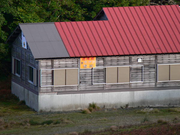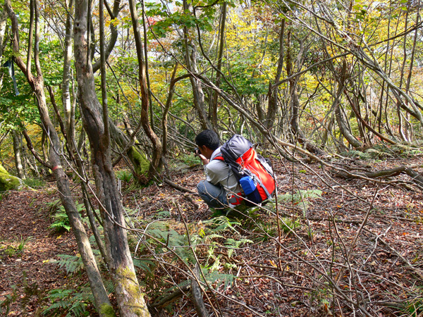 やっと、この記事で下りてこれそうですぅ(^^; 八雲ヶ原を出発した私達は、イブルギノコバ・広谷を目指し急ぎます。(14:22) 八雲ヶ原からガリバー青少年旅行村までは約3キロ。 コースタイムは2時間10分となっています。 スムーズに行けば、16:30にはガリバーに到着するはずです。 日没までには何とか間に合うかな? ブナ(かな?)の巨木があちこちに点在する山道を気持ちよく歩きます(嬉) かなり急な下りですが、滝を登ってきた分下りるのですから、それはもう仕方ありません。 このコース(登りの滝も含め)、案内板が沢山立てられているし、目印のリボンも数多く結び付けられていて、滝登りは怖いけど、道迷いについては安心です(^^ と、、、思ったら、案内板が落っこちていますよ。。。 木に引っ掛けられていますけど、矢印の方向は、、、、地面を指しています(^^; ありゃりゃ、、こちらは支柱だけが残っていて、案内板が無くなっています(^^; 分かれ道なんですが、、、 さて、、、どっちへ行けばいいんでしょ? 踏み跡を辿っていくと・・・山小屋? そういえば、地図にも幾つか山小屋が載っていました! 『望武小屋』と書かれています。 小屋の前には焚き火跡もあって、どなたかテント宿されたような形跡がありますが・・・ 小屋はかなりぼろッちいです。 今も使われているのでしょうか? ちょっと不気味で恐そうですが、中を覗いてみましょう(^^; 私たちが持ち歩いている『プリムスのガス』と同じものが置いてありました。 調味料やタレも、固まっもいないし、何年も前のものでもなさそうです。 ストーブは使われてるようには見えませんが・・・利用者もいるような感じです。 それにしても『味ポン』がやけに多い気がします。 二段ベッドというか、ロフトというか、、、、こちらはマットのようなものが敷かれています。 誰かここで夜を過ごしたのでしょうね。 WCです!トイレもあるんだぁ~ トイレは使えそうにありませんね? 自分も一緒に落ちてしまいそうです。 テントを持たない日帰りトレッキングで遭難しそうになった時は、雨風しのげるし、もちろん宿泊させていただくと思いますが、、、 最初からここに宿泊しようって計画は立てないかな(^^; 空気怖いし、、、何か出そうだし・・・ テントの方が寝心地良さそう。。 さ、さ、長居は禁物、そろそろ出ましょう。 もう一度さっきの案内板(無いけど)の支柱の所まで戻って・・ あっ! よく見ると、ほら、柱のところにどなたか手書きしておいてくださいます。『広谷』はこっちですよ~って(^^ホッ あれ?? 広谷へ向けて歩き出そうとしたダーリンですが、なんだか違和感が・・・ nちゃん、ちょっと待って! ザックになんか憑いてる! え?! 何やの?!と、不安げな表情のダーリン。 腰も引けています(^^; さっきの『望武小屋』からダーリンにくっついてきたハンガー君。 一緒に帰りたかったみたいですが、霊とかも憑いて来そうで、、、返してきました(^^; 小屋から暫く歩くと、通過ポイント、『広谷』に到着です!(15:00) 11月半ばとはいえ、山道を歩いているときは、じんわり汗も出てきます。だけど、ちょっと止まって休憩していると、すぐに身体は冷えてきて、山はもう冬なんだなぁと実感。。。 ほら、寒いと思ったら、雪虫ですよ! 雪虫(本当の名前は知りませんが、、)は、白いふわふわした虫で、この虫が沢山飛び始めると雪が降るんです。 もう直ぐ雪が降るんだなぁと思っていたら、翌日比良山に初冠雪がありました。 さすが雪虫君ですね。 雪虫君と戯れている時間はありません、、、 早くしないと、ダーリンがどんどん小さくなっていきます(^^; 待ってくださぁ~い! 望武小屋に寄道していた分ロスタイムになっていますので、少し急ぎ足で歩きます。 憧れの武奈ヶ岳を目前にしてですが、また今度来ますね。。。 この案内板、方角といっしょに、そこまで行くにはあとどれくらい距離があるのかも書かれていたらいいのになぁ・・・ 大擂鉢到着です!(16:38) この刻みは「八徳」という字だそうで、帰宅後知りました(^^; 恥ずかしながら誰かのエッチな落書きだと思ってしまったワタクシ、、、、ひとつ賢くなりましたので、皆様にもお伝えしておきます(^O^; 大正時代、八淵の滝を訪れた滋賀県知事が、八つの淵の「滝」の徳をこの大岩に念じ、「八徳」の文字を書き込み、その後、この文字を石屋が彫ったということです。 このへんてこな文字は、『篆書体』なんだそうです。 この出来事、『大正5年、時の知事は堀田』とされているのですが、当時の実際の知事は池松時和さん(大正3~6年)、堀田義次郎さんが知事だったのは大正8年から12年まで。微妙に食い違っていますが、、、気にしないでおきましょう、、、、 エッチな落書きではなく、ありがたい『教典供養塔』だということは間違いないようです(^^; さてさて、この川を渡らねばならないのですが、グズグズしてはいられません。。。 落ちても冷たいだけと言い聞かせて、ダーリンに続いて思い切って