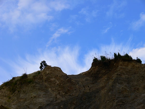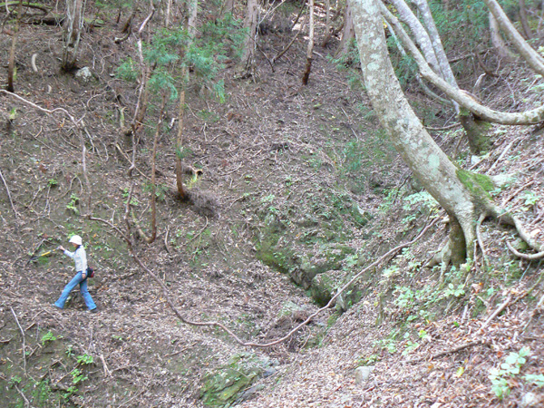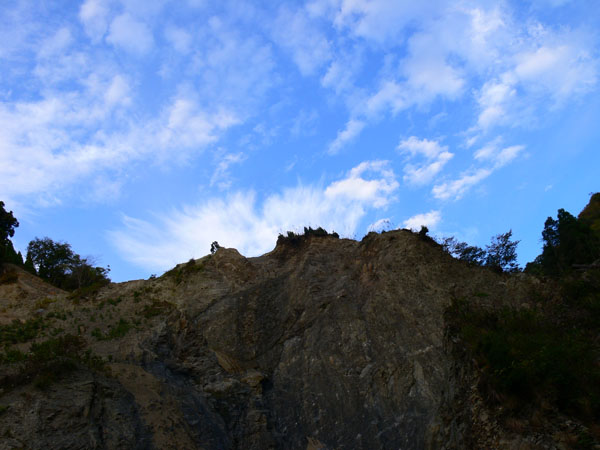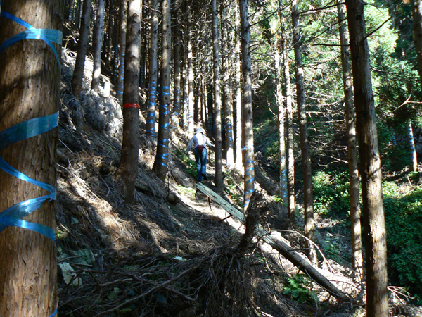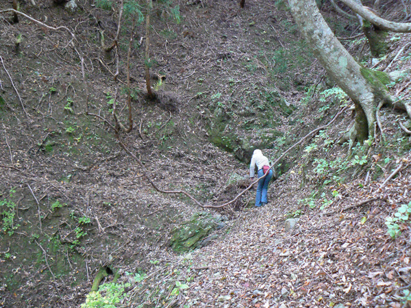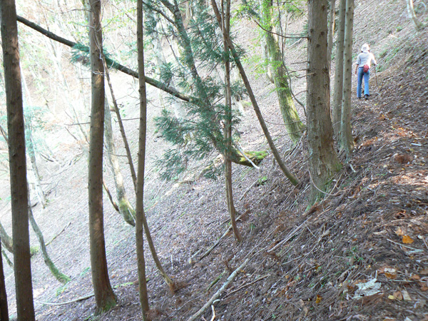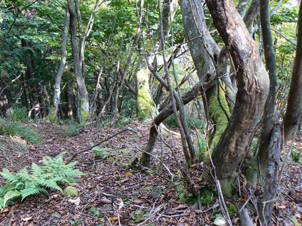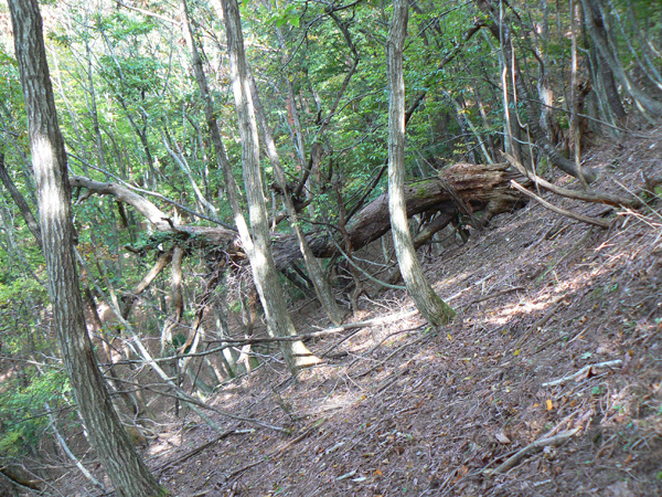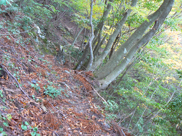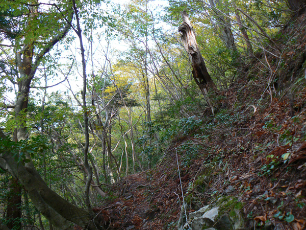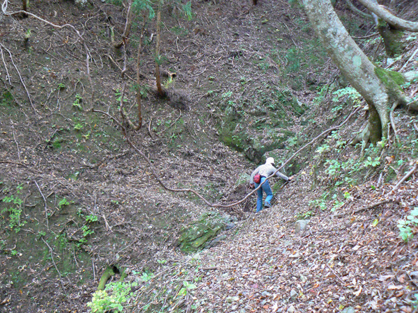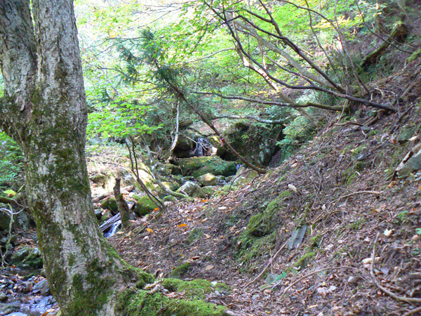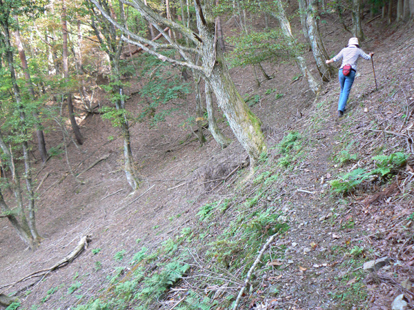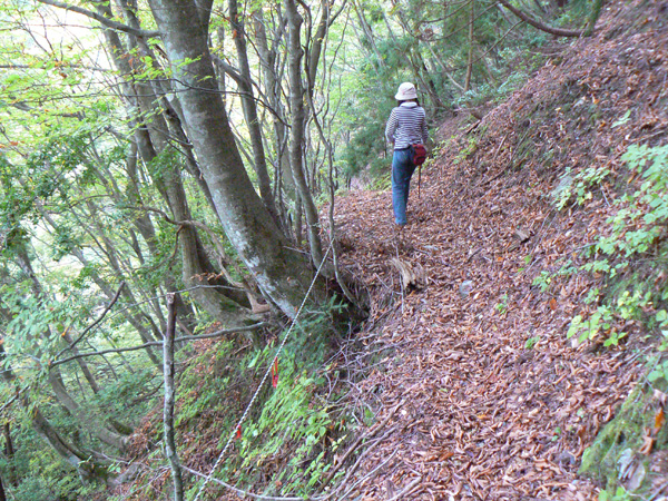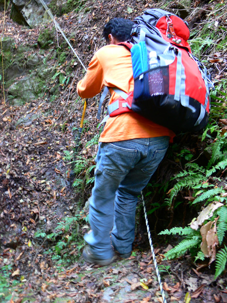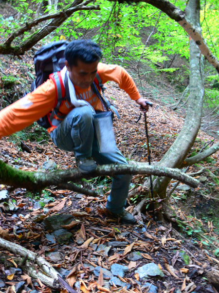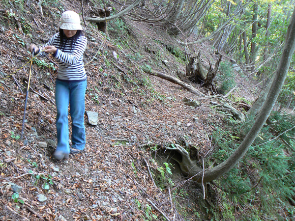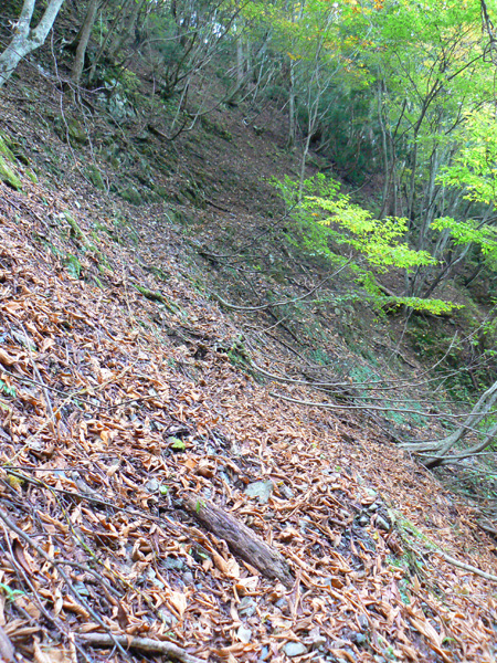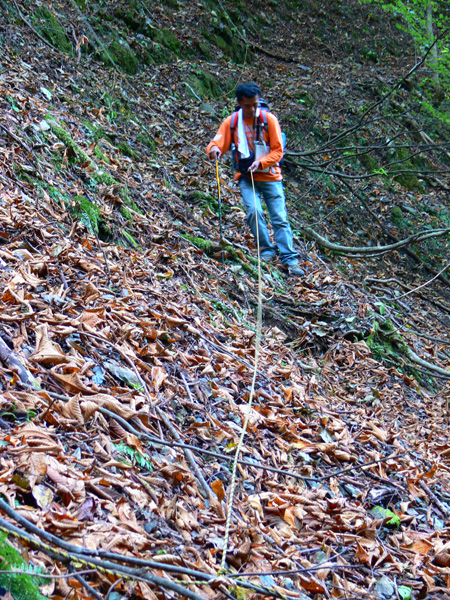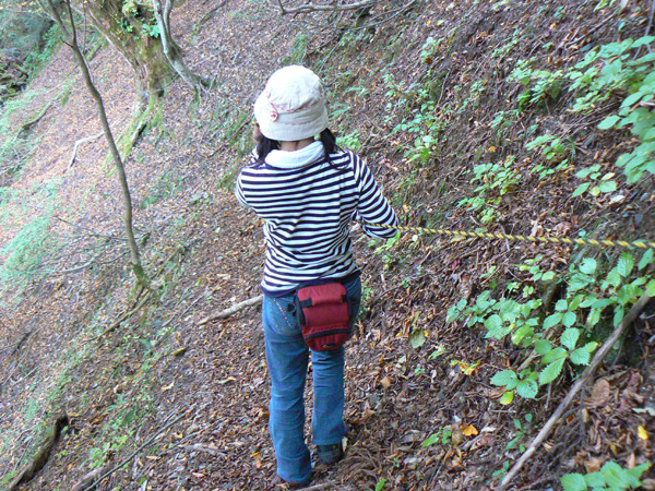 11:37 地蔵峠難路コースへの分岐に到着。 水休憩をしながらプチ会議 なぁ、(登山地図に)危ないマークがついてるで・・・ なぁ、難路ってどんな道のことやろ? なぁ、あたしらそんなとこ通って帰って来れるん? 等など、地図をチェックしながら、事前情報を再確認し、びびります(^^; こんなところでグズグズしてるわけにはまいりません。 この先どんなところで時間を取られるかわかりませんし・・・ 行くと決めたのですから、さっさと出発してしまいましょう。 (なんでか、やけに張り切っているあたし、、、心配です 笑) 道と呼べるほどの幅はなく、ずり落ちそうです。 こんな道を米俵を担いで歩くなんて、とても信じられません。 そんな道ばかりじゃなく、木々の間から景色が見えたり 恐竜みたいな倒木が居たり、 でかっ! こんなでっかい朽ち木に何度も出会いながら歩を進めます。 熊避けの鈴の音が遠くなると歩の速度を落とし、二人の距離が離れないようにしながら歩きます。 ダーリンが前を行く時は、5歩分も離れれば振り返ってくれるんですけどね(^^; そうこうしている間に、中間地点到着! もう、今来た分だけ進めば地蔵峠です(^^ 倒木やプチ土砂崩れ跡が多々ありますが、案内板もありますし、道は間違ってはいないようです(^^;ホッ 尾根沿いに緊張の斜め細道が続く中、こんな巨木が点々と・・ ね、ね、何か棲んでいそうな、でっかい木でしょ?! プチ土砂崩れがあったようです(^^; 歩いてる時じゃなくてよかった、、 なぁ、危ないマークってまだなん? と、尾根沿いの道を軽快に進んで行くと・・・ おぉっ! 最初のロープ?! と、思ったら、、、つるでした(^^; なぁなぁ、ここが危ないマークのところ? 違うやんなぁ、、、、? 再び尾根沿いの、斜め細道(しつこいようですが、、、道か?)を行くと、 今度こそ、ロープです! こういうロープの張ってあるところって、ロープに頼るなって言われますけど、、、頼ってしまいますってか、頼らないと渡れないし・・・(T_T) ヒジキ滝は目の前。 なぁ、ここが危ないマーク? 確かに、誰かのサイトで『ヒジキ滝へ降りるところが一番危険といえば危険やった』って、書いてあったけどなぁ。 危険マークつけるほど危険か・・? え。。。。 もっと危ないんがあるん????! 木を足で押し下げ、その間をくぐって先へ進むダーリン。。。 これが地蔵峠まであと1.1kmのヒジキ滝。 滝の底近くにある案内板のところが本来の道なのでしょうけど、道は完全に壊れてます、、、 登山地図の危ないマークは、ここのこと? しかーしっ こ、こ、これは、危ないやんなぁ? なぁ? ずり落ちながら越えたヒジキ滝の後にやってくる、崖(?)っぽはかなり『危』ないんですけどぉぉぉ 非常に危険で写真を撮る余裕もなかったんですけど、滝の底から上の写真のロープ場に上がる手前、ここが一番怖かったっ!! 道が完全に崩落、足場も全くなく、そしてロープもなく、川面まで数メートルの位置で岩(ってかその岩が上から落ちてきたのか?)にしがみついて進まなくっちゃいけないっちゅーことですよっ 一本のロープが終われば、次のロープを素早く掴むっっー! えーん、泣きながらダーリンの後ろに続くあたし(T_T) このあたり、軒並みロープでしたが、 なんというか、ロープがあるだけでほっとしますよね? あぅ。。。。 また、崩れてます・・? 最近の崩落でしょうか、、、、、 ロープがまだ設置されていません(T_T) 何に捉まったらええのん?? 時間は12:47 間もなく1時。 この調子で進んで、地蔵山まで行けるのでしょうか、、、 (つづく)