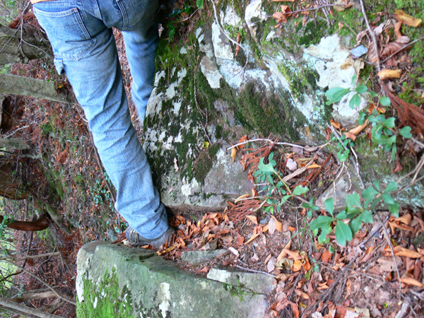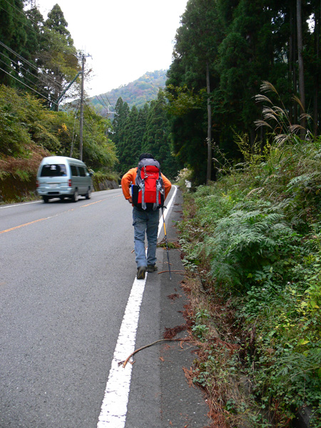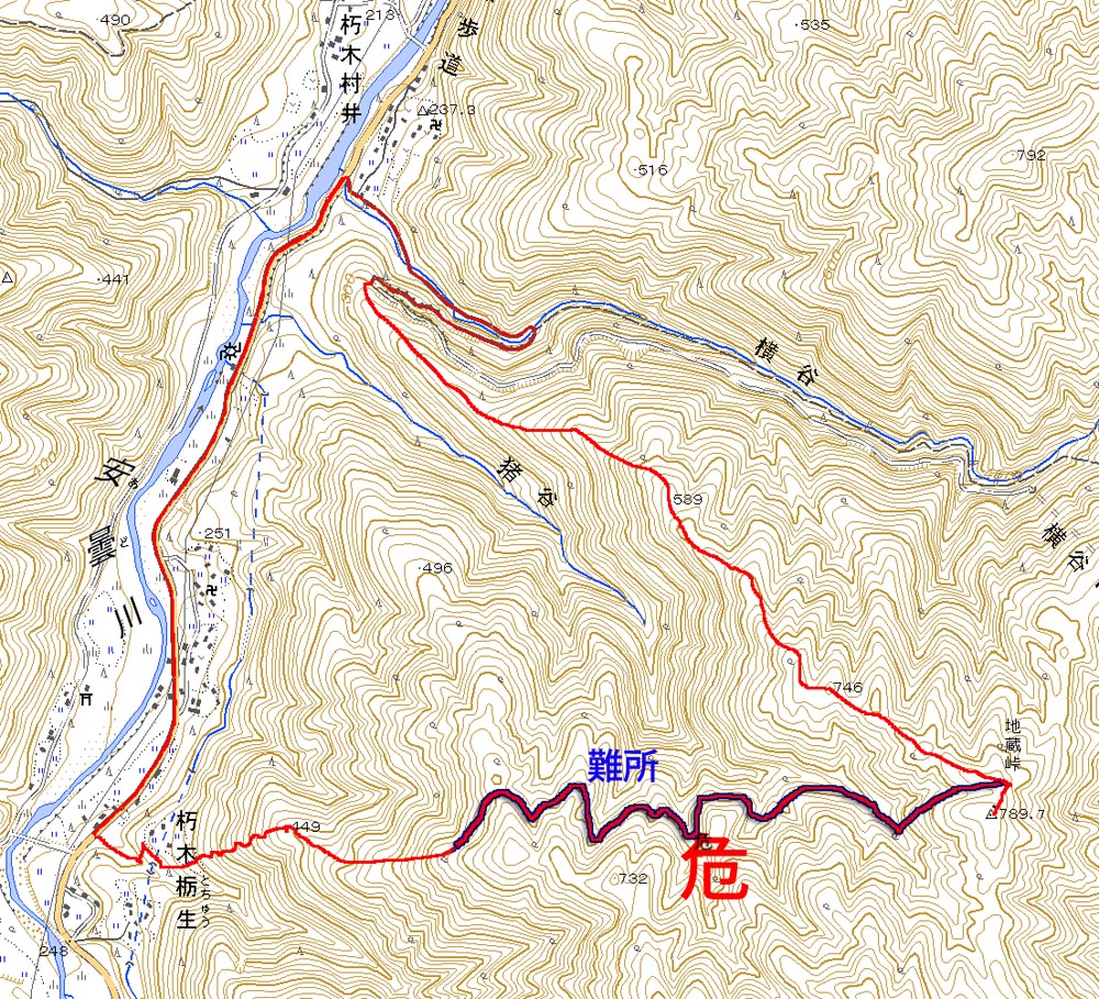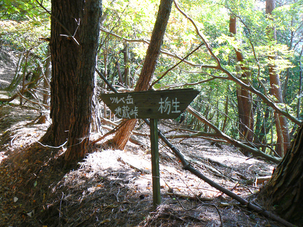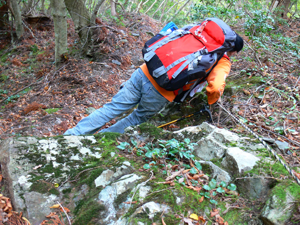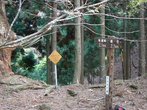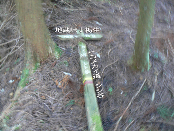 反省会(←という名目のメタボキャンプ)を終えた翌日、大きくなった体を少しでも元に戻すべく、、、、朽木のお山へ(^^; ダイエットもありますが、、、来年の日本アルプスへ向けて、厳しいトレーニングに入っているふらんぢぁとしては、難所と呼ばれている場所や、鎖場にも敢えて臨み、経験を積まねばなりません(>_<) ↑難路『コメカイ道』を行くダーリン 朽木大野から近いところにそんな場所はないかなぁと、探したところ、『地蔵山』に難路があるらしい。 ってことで、行ってきました。 濃紺のラインが難路と呼ばれる部分で、『危』のマークは、私たちがこれは危険!って思った『ヒジキ滝』付近、足の踏み場がなくて非常に怖かった場所です(><)。。 ・・・・・・・・・・・・・・・・・・・・ 行き先: 地蔵山 コース: 栃生-村井コース 日 時: 11月04日(日曜日) 10:52発 朽木栃生バス停前 →(4.2km)→ 14:03着 地蔵山 14:50発 → 16:10着 朽木村井バス停付近 → 16:50着 朽木栃生バス停前 朽木栃生から地蔵山山頂近くの地蔵峠を越えて高島にいたる道は、コメカイ道と呼ばれ、その昔、買い付けた米を担いで通った道 よーこんな道、重い米俵を担いで歩いた事! 普通に歩いてても、落ちそうなのに(>_<) 今更、取り立てて言うほどの事じゃないですけど、、、食べられる事に感謝して、良く噛んで、味わって食べましょう(^^; それでは、順を追って写真を掲載いたしますので、コースの参考にしていただけたら幸いです。 朽木栃生のバス停の前、お地蔵様の祭られている水汲み場に車を停めて、登山口へ向かいます。 水汲み場の湧き水はもちろん無料です(^^; なにか言われでもあるのか、車で来て水を汲んで帰る方が絶えないようでした。 登山口に付近のお家には、ワンコ君が2匹。 一匹はめちゃ吼えます。もう一匹は無言。。。 登山口です。 二匹のワンコの住まうお家へ向かう舗装された道から、山道に入りまーす! 植林の山道を暫く進むと、 左、休憩っちゅうことで、よっこらしょっとばかしに座ろうとしている私 右、(左とは別な場所ですが)休憩終了、『さ、いくで!』と急ぎ登り出す私(^^; いつの間にこんな写真撮ってたんや(--; なんだか私、張り切っています。 案内板が随所随所にあるのが嬉しいですね(^-^ (と、思っていたら、始めのうちだけでした、、) そして・・・『コメカイ道出合』 上の地図には記していませんが、イクワタ峠を経て釣瓶岳へと向かう道との分岐です。 いよいよここから、登山地図に『難路』と記された道に入ります。(ドキドキ) ちなみに、『コメカイ道』はこれから進む難路の方です。 行く手を阻む(?)倒木は何を意味するのでしょうか・・・ これからの難路に向けて休憩するようにとベンチの代わり? 行かない方がいいよと通行止めしているの? 時は11:37 つづく・・・